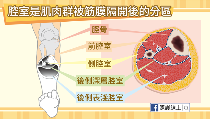 舉例來說,我們小腿部分(從膝蓋到腳踝)有四個腔室,分別是前腔室、側腔室、後側表淺腔室、後側深層腔室。
