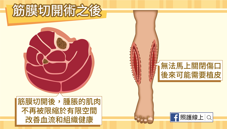 筋膜切開後,腫脹的肌肉不再被限縮於有限空間,改善血流和組織健康,減少後續細胞壞死的機會。筋膜切開手術之後,可能因為組織過於腫脹,無法馬上關起皮膚傷口,可能需要第二次、第三次手術,有時還需要植皮。
