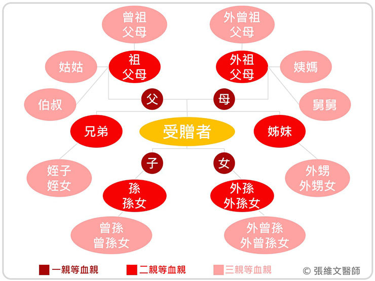 除了捐贈者本人同意活體捐腎外,還必須要徵求最近親屬兩人以上的同意。親屬範圍由近到遠的順位依序如下: