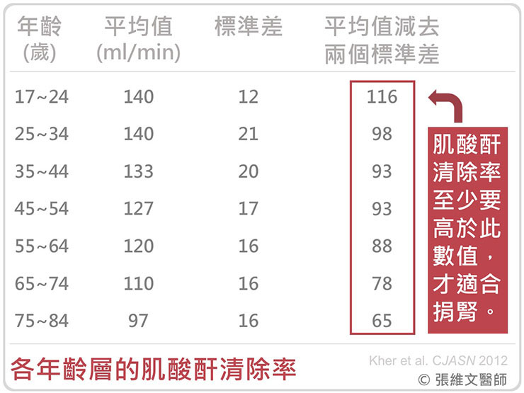 有些醫院會依照捐贈者的年齡,去評估肌酸酐清除率是否足夠,至少要高於平均值減去兩個標準差的數值,才適合捐腎給他人。
