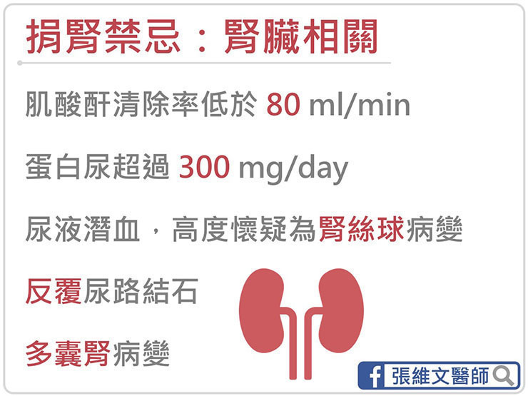 若尿中白蛋白的釋出量超過 30 mg∕day(albuminuria)或尿蛋白排泄量超過 300 mg∕day(proteinuria),表示腎臟組織有受損,血中蛋白質才會漏出至尿液中,這樣就不建議捐腎了。