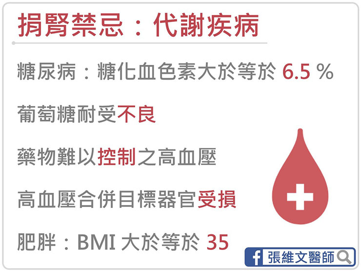 糖尿病患者不適合捐腎,因為他們本身就是慢性腎臟病的高危險群,若僅剩單顆腎臟在做工,恐怕會加速糖尿病腎病變的進展。