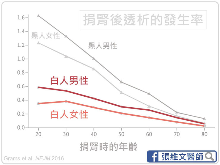 由於亞洲人的體質較接近白人,我們可藉此推算,若是在 20 歲時捐腎,之後終生得到末期腎病的發生率約是 0.3~0.6%;若是 40 歲時捐腎,未來得到末期腎病的發生率則約 0.3~0.5%。