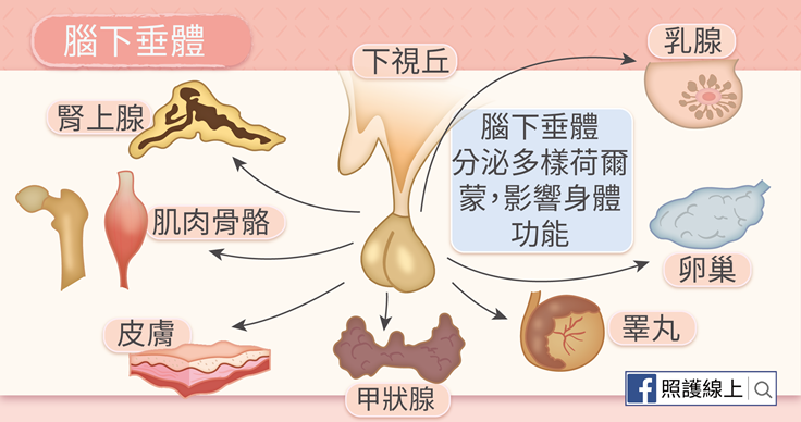 腦下垂體位在腦底部的中央,被蝶骨中的蝶鞍保護著,腦下垂體的體積並不大,重量連一公克都不到。腦下垂體與腦部的下視丘相連接,下視丘會分泌荷爾蒙進到腦下垂體,影響腦下垂體的功能。腦下垂體本身也會分泌多種的荷爾蒙,並分成兩個部分–前葉和後葉,前葉的腦下垂體可以分泌生長激素、促甲狀腺激素、促腎上腺皮質素、泌乳激素等等,多數的腦下垂體腫瘤是從前葉長出來的。腦下垂體的後葉無法自行分泌荷爾蒙,而是下視丘的延伸,能夠儲存、釋放下視丘分泌的催產激素、抗利尿激素這兩種激素。(抗利尿激素能讓腎臟留住水分於體內;催產激素則能促使子宮收縮,讓乳房分泌乳汁。)