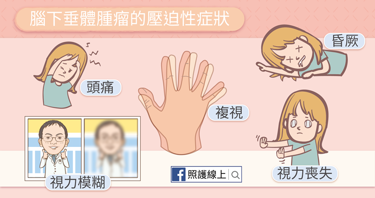 這些沒有功能性的腫瘤比較難被發現,通常是到了腫瘤體積造成壓迫症狀,導致頭痛、視力模糊、複視、突然視力喪失,或頭暈、昏厥時才找到問題。