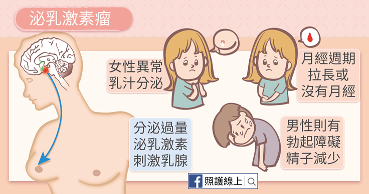 最常見的腦下垂體腫瘤是分泌泌乳激素的腫瘤。泌乳激素(Prolactin)會刺激乳腺細胞生產乳汁,泌乳激素瘤容易發生在年輕女性身上,讓女性體內的泌乳激素濃度過高,導致女性月經週期拉長,久久才來一次,甚至完全沒有月經,且兩側乳房有異常乳汁分泌。然而泌乳激素瘤亦有機會發生於男性身上,導致男性乳房異常變大,且精子數量下降,有勃起困難。男女性的患者都會性慾降低、不孕、骨質疏鬆。