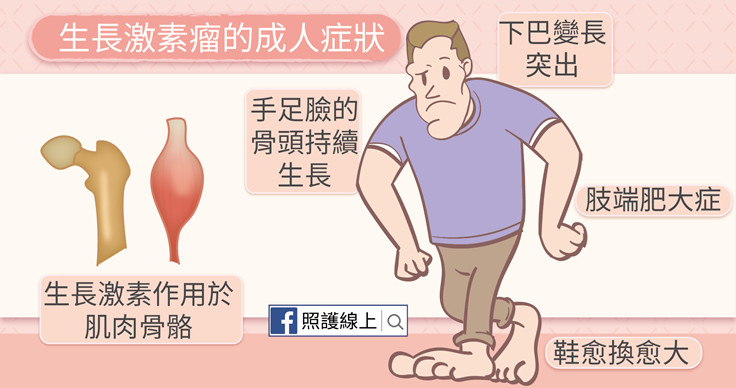 生長激素(Growth hormone)作用在肌肉、骨骼,能影響醣類、蛋白質、脂質的代謝,在每個人的孩童時期,生長激素會促進我們長高,但如果孩童時期若有生長激素瘤,分泌了過多的生長激素,就可能長得太高,長得太快,容易關節痛,變成巨人症(gigantism)。到了成人時候,原本成人腦部只會分泌少量的生長激素,但如果因為有生長激素腫瘤而分泌異常過量的生長激素,其他骨頭大小不會明顯變動,但在手部、足部、臉部的骨頭會持續生長,患者因而發現原本的戒指、帽子戴不下、鞋子尺碼一直變大,臉部樣貌變化,下巴變長與突出,我們稱為肢端肥大症(acromegaly)。