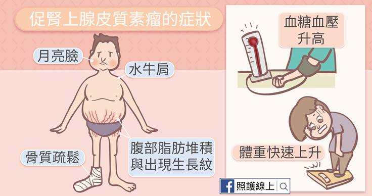促腎上腺皮質素(Adrenocorticotropic hormone)會刺激腎上腺分泌皮質醇等類固醇,大概十位腦下垂體腫瘤患者裡,有一位是患了促腎上腺皮質素瘤,會讓體內有過多的類固醇,患者表現無法解釋的快速體重上升,臉、胸、腹部的脂肪累積,肚子和胸部出現紫色的生長紋,容易長痘痘,臉變紅變腫,頸部後方堆積不少脂肪,一般稱為月亮臉和水牛肩,血壓和血糖也會變高。我們稱為庫欣氏症(Cushing’s disease)。