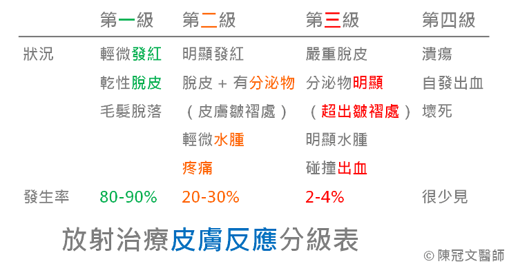 最後,附上放射治療皮膚反應的變化時序,以及皮膚反應分級表: