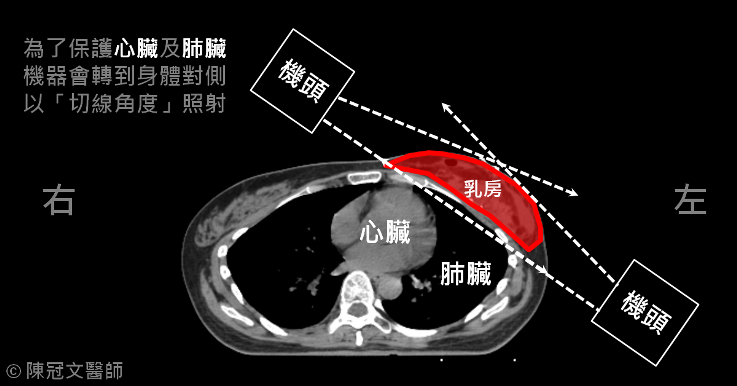 A:如同前面的示意圖所示,這是因為 X 光照射角度的關係,為了保護肺部及心臟,醫療團隊會選擇以「切線角度」照射乳房,來讓肺部和心臟接受到的輻射劑量降至最低。