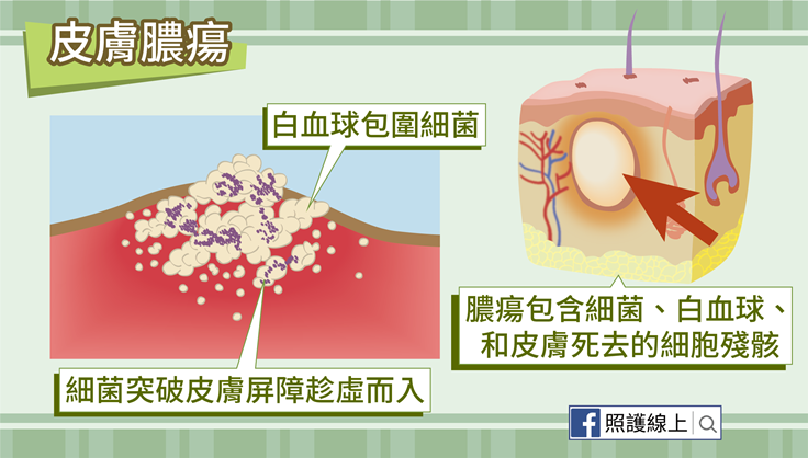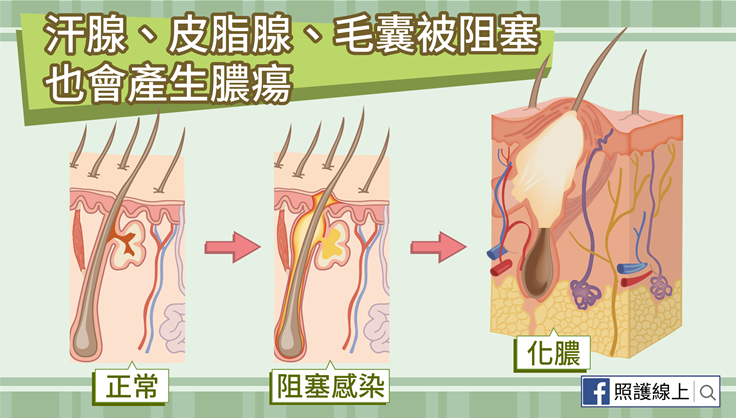 我們這裡說的皮膚膿瘍,就是一包膿積在皮膚下面,有時你會聽到老一輩的人用台語稱之為「金包銀」。會有一點像痘痘一樣,但是比較深,也比較大。這些皮膚膿瘍除了發生在皮膚傷口之外,原本的汗腺、皮脂腺、毛囊若被阻塞,或是原本就長了皮膚囊腫,細菌在裏頭孳生後,也會發生膿瘍。