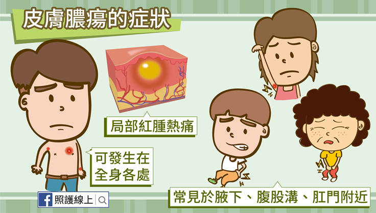 患者會在自己皮膚上看到紅紅的一圈,摸了會痛的腫塊,這腫塊圓圓的、硬硬的,裡面有糊糊、膏膏的內容物。這種皮膚膿瘍可以發生在身體的各處,最常見於腋下、腹股溝、會陰處及肛門附近。