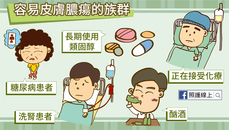 有些免疫力比較弱的族群,會比一般人還更容易有皮膚膿瘍發作,像是糖尿病患者且血糖控制不佳時,長期洗腎的病患,或有其他疾病正長期使用類固醇的病人,都比較常出現皮膚膿瘍問題。正在接受化療的癌症患者免疫狀況也會比較差,或一個人突然受了嚴重外傷或嚴重燒傷,導致免疫力下降及皮膚屏障缺失,較容易有皮膚感染的問題。酗酒者及有藥物濫用成癮問題的人同樣會發生皮膚膿瘍。