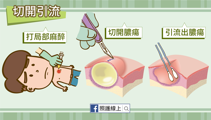 然而,如果已經形成膿瘍,常常就只能靠切開引流來改善情況了。醫學術語上叫做「I and D」,代表incision and drainage – 切開與引流,醫師替患者打局部麻醉之後,拿手術刀切開膿瘍處,引流出膿瘍。打局部麻醉時很難麻醉到這個已經化膿的區域,但可以讓周遭的組織失去感覺,後來擠壓、拉扯比較不痛。雖然對患者來說,「切開引流」聽起來很原始,聽到要手術大家也很容易感到懼怕,但實際上把膿排乾淨之後,確實是最有把握讓傷口處癒合的方式。