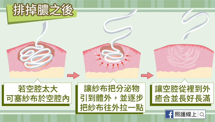 如果排掉膿之後,這個空腔太大,醫師會在手術後塞紗布於空腔內。因為當空腔太大的時候,我們身體會試著分泌液體填滿這個空缺,不久後可能又積成一包囊腫或膿瘍了!因此排膿術後醫師會先在空腔裡塞著溼紗布,這樣溼紗布可以把新的分泌物引流到體外,才不會積在皮膚下,而且每次換藥時,把原本的紗布紗條往外拉一點,等於在逐步縮小紗布範圍的過程中,讓空腔長肉,並讓它長好、長滿、長的更紮實,如此才有機會讓空腔由裡到外癒合完全。如果這個空腔真的很大,患者可能就無法自己向外拉紗條,那就要考慮住院,或固定到診所換藥,由醫師或護理師在無菌消毒後,取出所有紗布,並放置新的紗布,逐步試著塞少一點、短一點,讓空腔逐漸長實長好長滿。