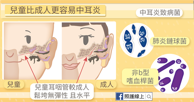 孩子的耳咽管尚未發育完成,與成人的相比,兒童的耳咽管較短、鬆垮、且走向較水平。所以,一旦孩子感冒或是長期過敏,帶有細菌或病毒的鼻咽分泌物會比成人容易經由耳咽管進入中耳空間,導致中耳腔的發炎。因此有時候我們會稱中耳炎是一個小孩子的病,因為成人比較少感冒、耳咽管也較垂直、長、有彈性,因此中耳炎在大小孩和成人是相對少見的。
