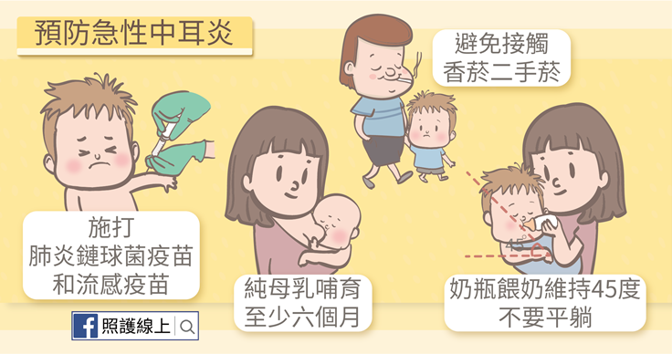 目前研究已證實有許多方式可以預防中耳炎的發生,簡單又有效的方式包含前述的肺炎鏈球菌疫苗和流感疫苗,另外還有純母乳哺育至少六個月、避免接觸香菸和二手菸都能降低中耳炎的發生。此外,改變生活方式,減少感冒的機會、良好控制孩子鼻子過敏的症狀、嬰幼兒用奶瓶餵奶要維持45度的角度、不要平躺、六個月大後減少或不要使用奶嘴,也都是能有效預防的方式喔!