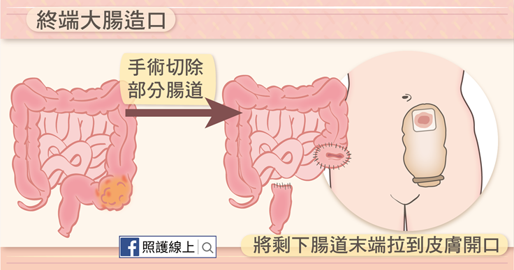 現在,得到癌症不是世界末日,醫師可以用手術、電療、化療、標靶治療等方式幫助患者對抗大腸癌;在治療大腸癌的過程中若有需要,會替患者做腸造口,擁有腸造口也不是世界末日,大腸造口的意思是,經由手術將大腸與皮膚相連,讓腸內的糞水糞便從此開口流到體外,而非經過肛門排出,也就是建立一個新的讓腸子通往外界的開口,排除廢氣(放屁)及廢物(糞便)。
