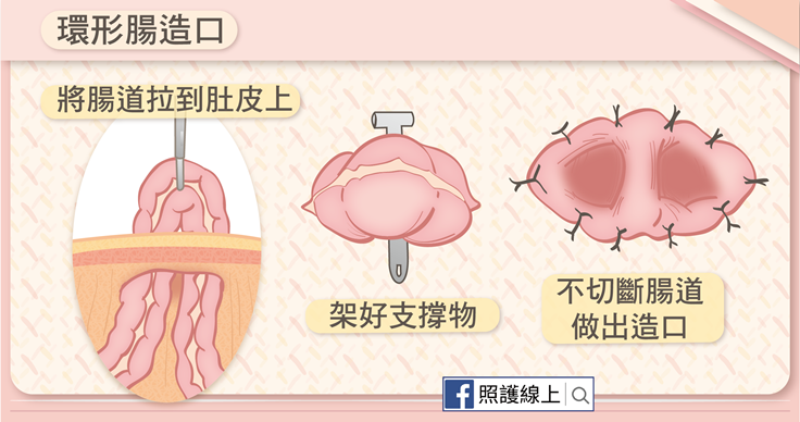 通常這是暫時性的腸造口。手術時醫師並沒有沒有切斷腸子,只是架高腸子到皮膚表面,劃開後再將腸道與腹部皮膚吻合。這樣的作法可以幫忙減壓,讓大部分的糞水由此排出,但因為沒有截斷腸道,患者還是有機會從肛門排氣排便。常見的作法是由橫結腸來做環形腸造口,創造於右上腹的造口位置。