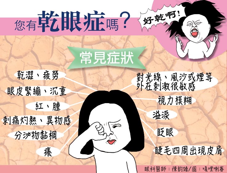 最近常常覺得眼睛又紅又累、有時視力模糊、突然刺痛眼淚直流、比別人怕光怕風怕空污。去買了舒緩疲勞的眼藥水,點的時候涼涼的很舒服,但一陣子後症狀都不見好轉。