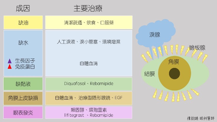 ▲ 缺黏液型:最少見,造成原因為缺乏維他命A、慢性結膜炎、類天皰瘡、化學性灼傷等使得結膜杯狀細胞破壞,造成分泌黏液不足。治療藥物如 Diquafosol、Rebamipide可增加黏液層的分泌使淚水穩定,目前台灣尚未引進。