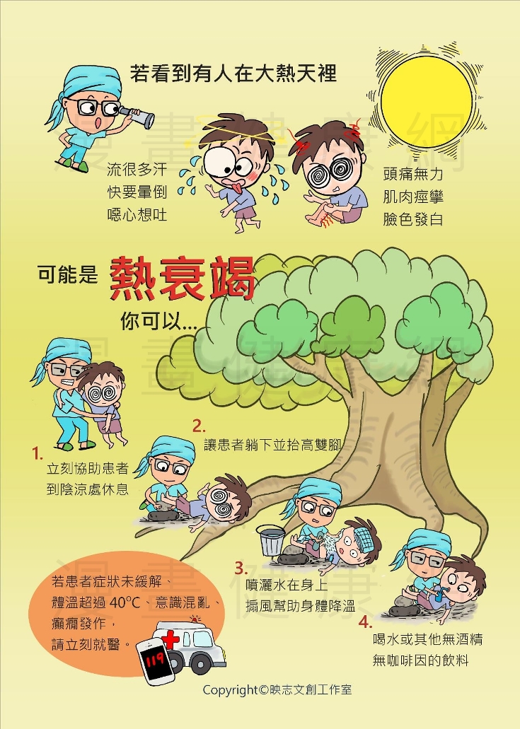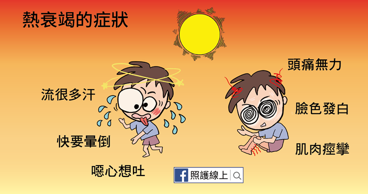 台灣是亞熱帶國家,「熱」對我們來說並不少見,每每都可看到新聞說,今天中午的溫度又突破紀錄了!但要提醒大家的是,熱衰竭是會讓人致命的疾病,千萬不要等閒視之,也不要以為「這是種磨練」就繼續待在超級炎熱的環境,或甚至繼續運動、若注意到環境太熱且患者已經出現症狀,就要立即停下活動或離開炎熱環境,並就醫接受治療。