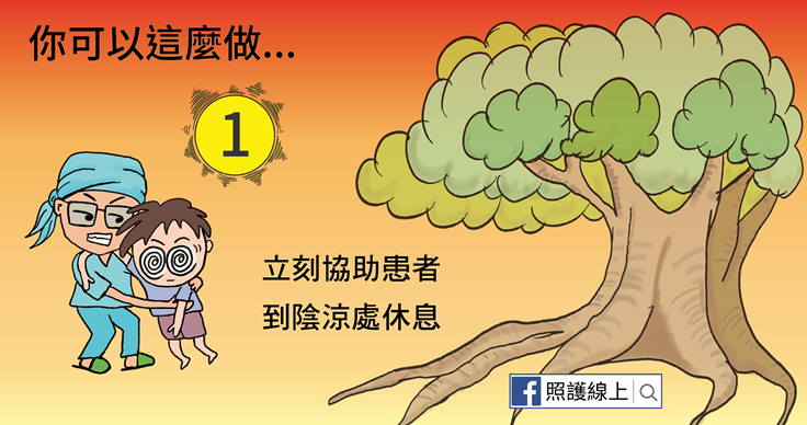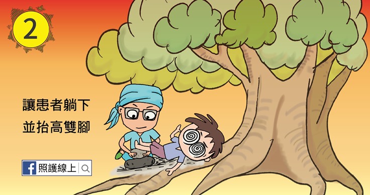 協助患者到陰涼處休息,回到屋簷下、樹蔭下等不被太陽直射的地方,若能進入有冷氣空調的室內最好。