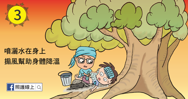 可以噴灑水在患者身上,幫忙搧風讓患者身體降溫,也可用冷毛巾覆蓋患者的脖子、腋下、鼠蹊處,或找到電風扇或冷氣幫忙降低患者體溫。但不要從患者頭上突然潑下一堆冷水。