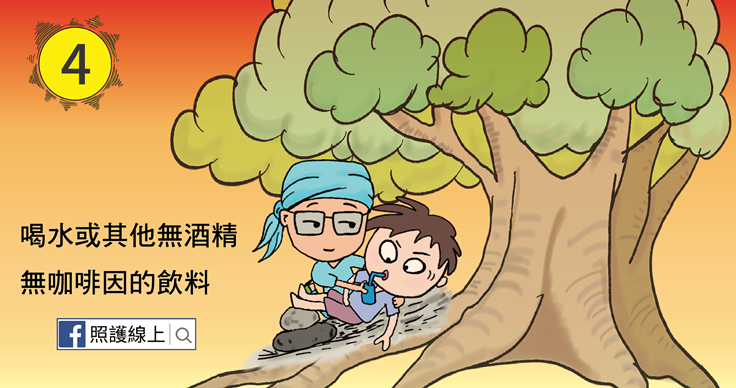 讓患者喝水或運動飲料,大量補充水分及鹽分,但記得不可以喝含酒精或含咖啡因的飲料,這些都容易血管擴張或利尿,反而會讓患者容易脫水。