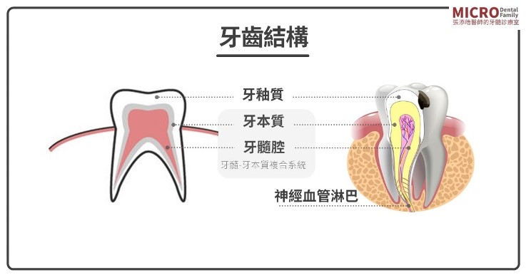 牙齒與其身體的組織或器官不太一樣,因為牙齒是屬於一種封閉的結構,外面一層層是很硬的牙釉質、牙本質、牙骨質結構;裡面是一個空腔,我們稱之為牙髓腔。這個空腔裡面含有的內容物,我們統稱為牙髓組織,其中大致包含有神經、血管、淋巴以及其他的附屬組織。〈請看下圖〉
