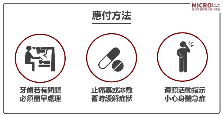 ● 遇到氣壓性牙痛當下,除了止痛藥之外,可以考慮冰敷緩解;但要非常注意是否有心臟、或腦部神經血管方面急性情況。