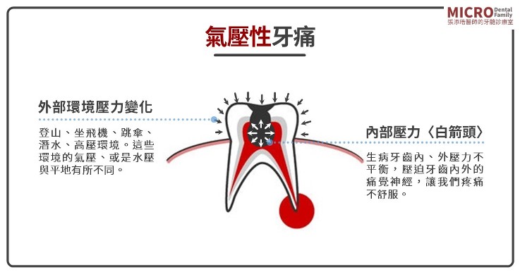 健康情況下,這些結構在外在合理的壓力變化時,都有一定可以調適承及受的範圍,幾乎不太有症狀,但當這些結構生病了〈蛀牙、外傷、牙裂、牙髓炎、牙髓壞死、牙根尖周圍發炎、牙周問題…等〉,反而會因為氣壓的變化而擠壓牙齒內部的神經〈牙髓神經 〉、或是牙齒周圍的神經〈牙周神經〉,而造成牙齒疼痛。〈請看下圖〉