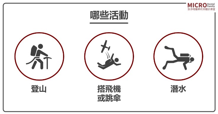 ●學者建議,一般的牙科處理完24小時內、以及牙科手術〈拔牙、牙周手術、牙根手術…等〉 7 天以內,不建議坐飛機或是潛水、及進入外界壓力變化大的地方。不過,有疑問、或特殊情況請遵照您的牙醫師指示喔!