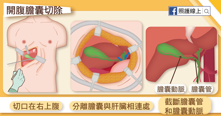 在過去,膽囊切除手術是直接開腹。外科醫師會在患者右上腹處,沿著肋骨下緣約兩指幅的皮膚處,劃下10到15公分長的傷口。切開皮下組織、肌肉層、腹膜後,進到腹腔內。架置好牽引器械,讓腹腔內視野清晰,用器械夾住膽囊後,把膽囊與肝臟相連處逐步分離,來到膽囊動脈與膽囊管處,確定兩者的位置後,可用縫合、夾子等方式結紮並截斷,即能取出膽囊。