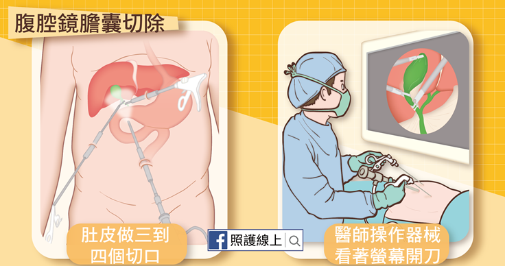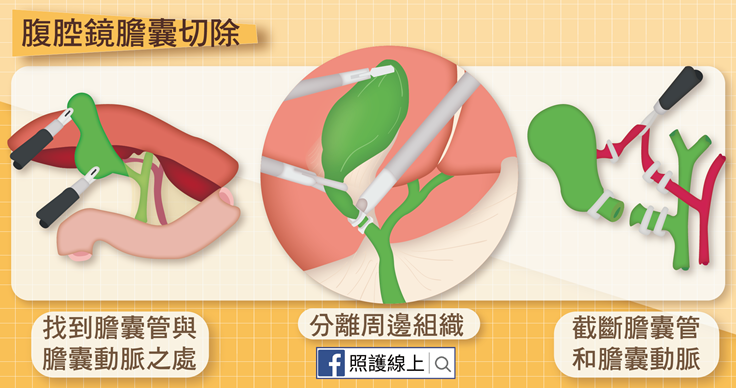 腹腔鏡的手術方式通常會與開腹膽囊切除時的順序不同,醫師會先找到膽囊管與膽囊動脈之處,確定解剖構造位置後,就可以用夾子、縫合等方式結紮膽囊管與膽囊動脈,截斷分離後,再將膽囊與肝臟相連處做分離。最後,再從肚臍的孔取出膽囊。大部分患者術後不需要放置引流管。接受腹腔鏡膽囊切除手術的話,因為傷口只有三到四個一公分左右的傷口,並不大,患者不太會有疼痛問題,常常在手術後隔天就可以出院了。