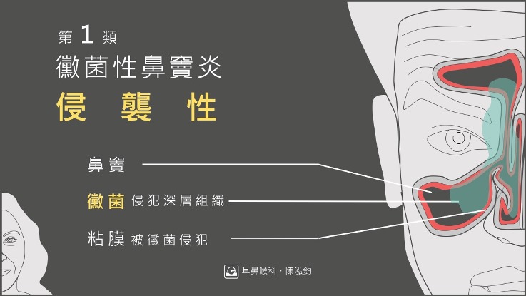 依據黴菌侵犯鼻腔的速度和嚴重程度,可以將黴菌性鼻竇炎分成兩大類:「非侵襲性」以及「侵襲性」。這裡要請您特別留意的,是光聽名稱就很可怕的「侵襲性」黴菌性鼻竇炎。