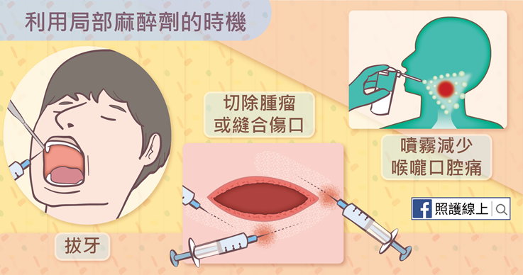 局部麻醉劑除了是針劑形式外,也有凝膠類或噴霧類的,可以拿來直接治療疼痛。不管患者是喉嚨痛、或是嘴巴裡面有潰瘍,都可以用噴的、或擦的局部麻醉劑止痛。臉部打雷射之前,也可擦上局部麻醉劑止痛。還有很多長輩患有關節痛,要靠著關節腔注射類固醇加局部麻醉劑來止痛。
