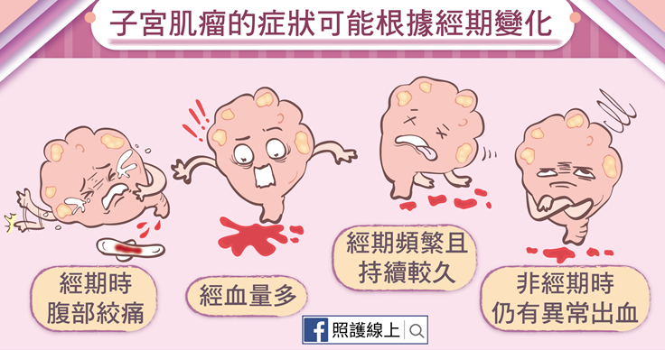 子宮肌瘤不一定會帶來不適,有時真的沒帶來什麼麻煩或症狀,這類型的子宮肌瘤就不一定要處理。有時子宮肌瘤帶來的症狀會根據經期而變化,例如經期時腹部絞痛;經血量多,帶有血塊;經期較頻繁且持續時間較久;或在非經期時仍有異常出血。(這些症狀有時與子宮內膜異位造成的很像,有時從症狀難以區分,需要影像學檢查確定病因。)