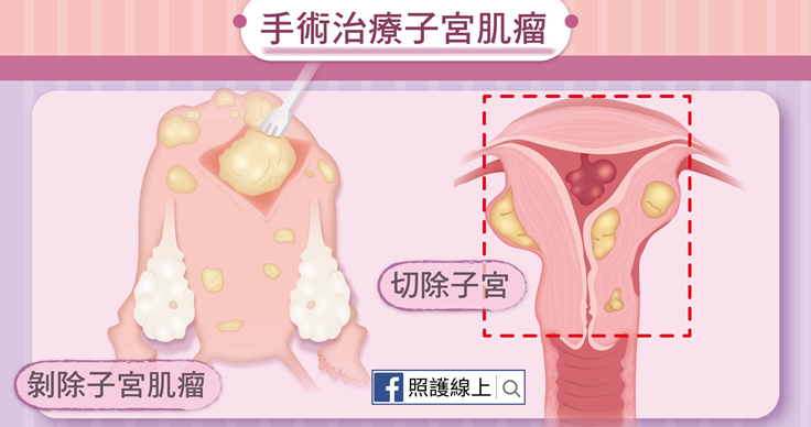 大部分的子宮肌瘤不會快速長大,因此只要不是擔心惡性變化的話,患者通常有段時間可以好好考慮是否要接受手術。手術分成僅剝除子宮肌瘤的手術,和直接切除子宮兩種。剝除子宮肌瘤的手術,顧名思義,只有移除一顆顆的肌瘤,會保留子宮及生育能力,但之後又長出子宮肌瘤的機率還是很大的,因此若還想生小孩的話,手術後最好考慮盡快懷孕。至於切除子宮的手術是唯一能保證肌瘤不再復發的,但女性會因此而喪失了生育能力。