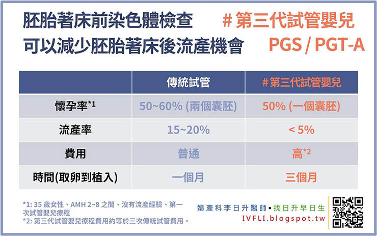 我們來詳細比較「傳統試管」跟「PGS胚胎著床前染色體檢查(第三代試管嬰兒)」的差異。