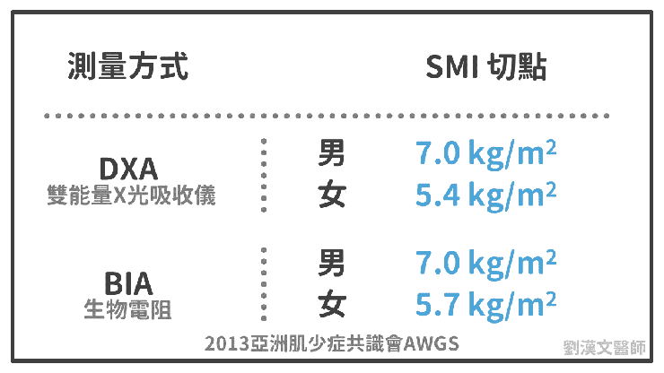 肌肉質量評估的方式之一,是看骨骼肌肉質量指數 SMI。跟身體質量指數 BMI 的概念一樣,只是分子變成四肢骨骼肌肉質量。