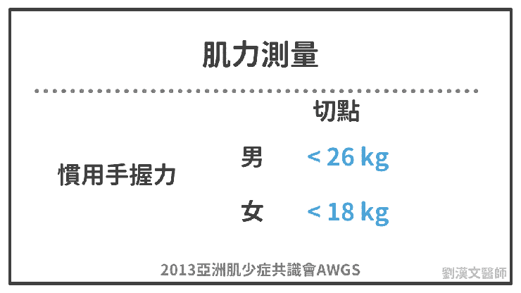 用握力器來測量肌肉力氣,以文獻中研究對象握力最低的 20% 做切點。