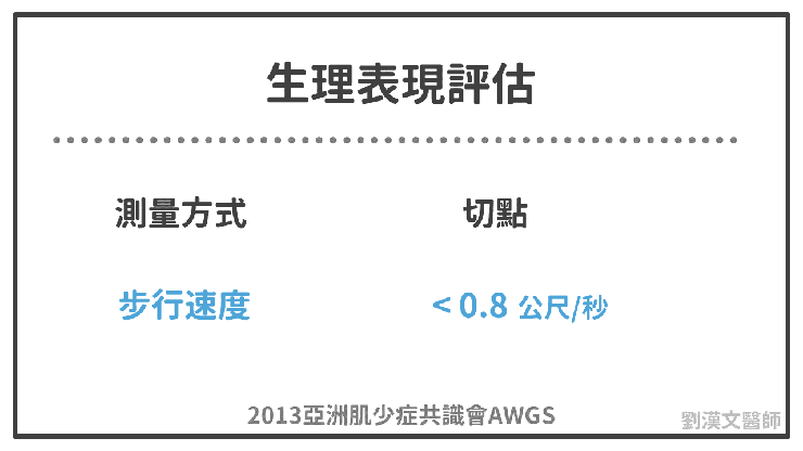生理表現有一些不同的評估方法,以 2013 年的亞洲肌少症共識會的建議,用步行速度小於 0.8 公尺/秒為切點。