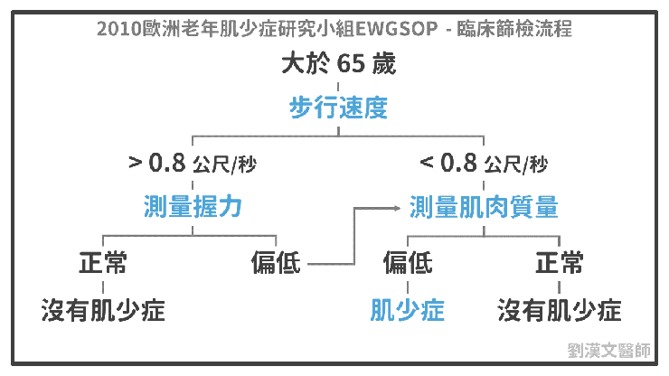 臨床上篩檢的流程,歐洲和亞洲版本有點不一樣。握力和行走速度比較容易執行,所以都建議先做。測量肌肉質量的 DXA 機器成本較高,都放在最後才做。