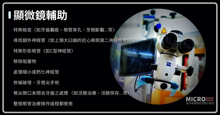 而牙科顯微鏡可以協助醫師達到更佳的微創操作,在牙科的應用已經非常廣泛了。在我們根管治療的使用時機如下: