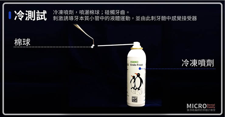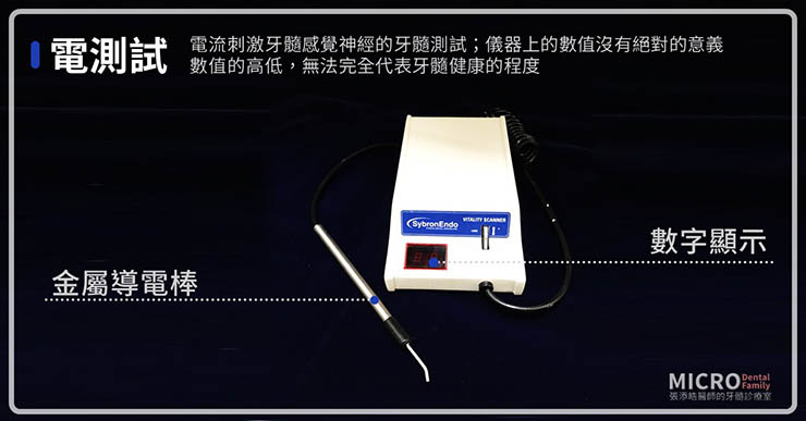 在5-6種的牙齒活性測試中,醫師常使用以下三種:電流、冷、熱,來收集您的牙髓的活性。這些單獨看數值、及溫度反應能當參考,還要配合其他臨床發現或不同時間點的測試,互相比較後才有意義。