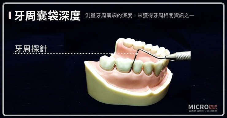 這也是病人害怕的測試之一,也是病人常誤解醫師為什麼使用尖尖的東西刺牙肉。醫師常會利用牙周探針〈尖尖的東西,上面有刻度〉去測量牙周囊袋的深度,來獲得牙周相關資訊之一。