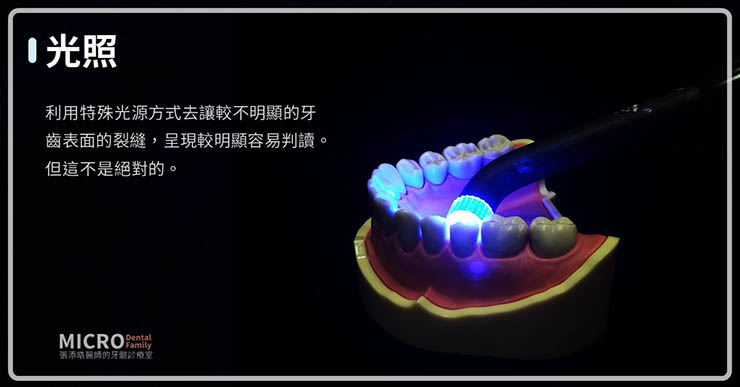 根管治療診斷工具之一,就是利用染色或特殊光源方式去讓較不明顯的牙齒表面的裂縫,呈現較明顯容易判讀。但這不是絕對的。