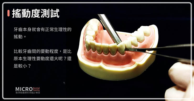 而醫師也會用適度的力道搖一搖牙齒,牙齒本身就會有正常生理性的搖動。醫師會比較牙齒間的要動程度,是比原本生理性要動度還大呢?還是較小?