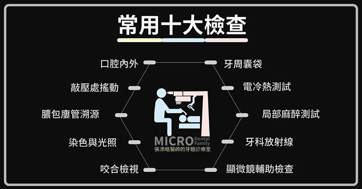 接下來,為您介紹根管治療最常用的10大檢查:以下10大項檢查是最常見的,在這牙髓病領域、當然不止這10大項檢查,還有一些特殊檢查,篇幅關係,之後再另外整理。另外,這邊我不介紹太多理論,以後的文章中會針對每一項詳細介紹。
